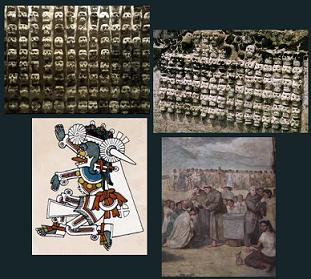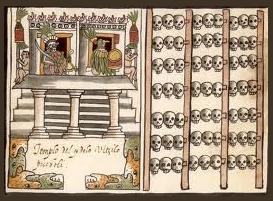 Su altar llamado "tzompantli", estaba adornado con cráneos ensartados por medio de hoyos que se les hacían a los lados, y los cuales eran de quienes habían sido sacrificados en honor a los dioses; así también la imagen del rostro del señor del inframundo y los muertos, Mictlantecuhtli, eran comunes en la vida de estas antiguas culturas.