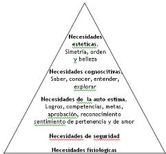 ![]() En un contexto de motivación debemos tomar en cuenta siempre que el niño altamente creativo debe de encontrarse permanentemente motivado, y esto lo entenderemos mejor si estudiamos un poco las necesidades básicas y su jerarquización según Maslow, quien explico que las personas no pueden crecer y actualizarse en ningún sentido o desarrollar habilidades personales sin antes estar cubiertas sus necesidades primarias y básicas. Cubrir las necesidades relacionadas a las fisiológicas como la seguridad, el sentido de la pertenencia, el amor y la autoestima; será algo primordial pues de lo contrario el comportamiento humano se vera transformado en un bajo nivel de sobrevivencia animal. El crecimiento en la motivación se hará que se cumplan las necesidades y a sus vez que surjan altos niveles en el cumplimiento de las mismas, lo cual dará como resultado la actualización y desarrollo personal. Ejemplo de la Pirámide de las Necesidades de Maslow ![]() De la misma forma existe por supuesto una pirámide similar a fin de jerarquizar las necesidades intelectuales en donde la base será el conocimiento de la lectura, la escritura y la aritmética; posteriormente aparecerán el conocimiento y sus aplicaciones, el análisis, la síntesis y la evaluación de las ideas las cuales son importantes para alcanzar el nivel optimo de la jerarquización el cual será la producción creativa. Todos los niños creativos deben de ser motivados a subir estos niveles en la jerarquización pero no lo lograrán si no han dominado las bases.