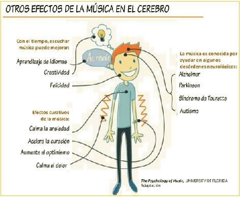 Otros efectos de la música en el cerebro. - Con el paso del tiempo, escuchar música ayuda a mejorar las habilidades del lenguaje, la creatividad y ayuda a ser más feliz. - La música tiene ciertos poderes curativos: Disminuye la ansiedad, ayuda a sanar más rápidamente, incrementa el optimismo y disminuye el dolor. - Se sabe que la música ayuda a tratar ciertos desórdenes neurológicos como Alzheimer, mal de Parkinson, Síndrome de Tourette y autismo. |